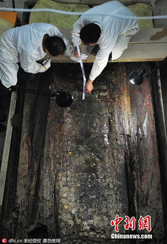 5月9日下午,在海昏侯墓文物保护工作站大厅中央,揭开棺盖板的内棺就放置在正中央。内棺与棺床已经被挤压成一块,而内棺中最为显眼的就是一床金缕琉璃席。琉璃席由2000多片一小片一小片的琉璃片串制而成,每一片琉璃片之间都是由金缕串连。琉璃片上并没有纹路装饰,但是每片都有孔眼,用来串连。而在琉璃席四周还编缀了极其精美的装饰包边,包边以贴金、彩绘,并镶嵌云母片与一些玉制饰件作为装饰,还等距地串联了柿蒂纹的青铜饰件。图为考古人员正在测量内棺文物的长度。 王祺 摄 图片来源:东方IC 版权作品 请勿转载