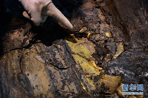 2015年12月,江西海昏侯墓考古人员在主棺的内外棺之间发现了多块金板。经秦汉考古权威专家确认,这是汉墓考古史上首次发现的金板,或将提供墓主人的重要信息。金板位于内棺和外棺之间的南侧空隙处,在精美的漆箱下面。目前,金板只露出一角,具体大小还看不清,目测有好几块叠压在一起。记者 程迪 万象 图片来源:新华网