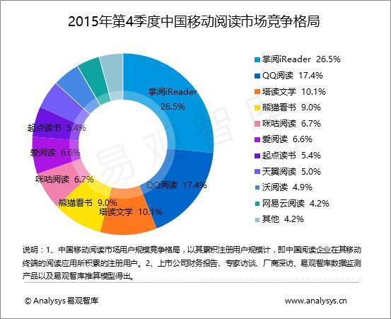 根据Analysys易观智库发布的《中国移动阅读市场季度监测报告2015年第4季度》数据显示,百度文学旗下熊猫看书占据中国移动阅读市场的9%,较1季度下降0.6%;而多酷及纵横中文网这被归为4.3%的其它类。