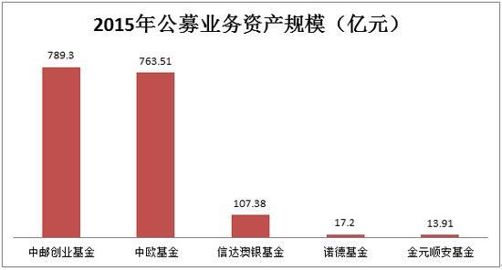 2015年公募基金资产规模763.51亿元,排名第31位,比2014年公募基金资产规模254.58亿元,增长近3倍,排名比2014年40位,上升9位。2015年非货币基金规模620.24亿元,排名第19位。2015年基金专户业务260亿元,排名第33位。