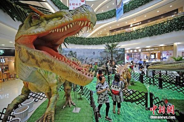 7月1日,消失于亿万年前的“地球霸主”穿越时空,空降天津熙悦汇购物中心。现场,16米长的霸王龙、三角龙、暴龙等强大阵容吸引全城市民火热追捧。中新社记者佟郁 摄