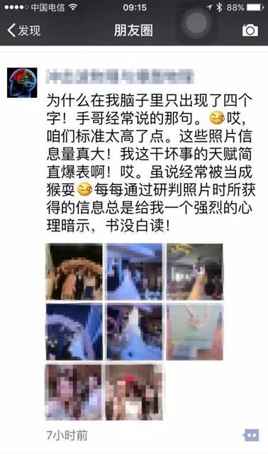 7月10日当天,罗瑜珊和余婧等6名同学在北滨路参加严小姐婚礼,大家聚在一起兴奋的合影,为严小姐送出祝福。但大家万万没想到,婚礼上的自拍照,竟然在当晚凌晨两点出现在范先生的朋友圈中,范先生还附言讥讽:“这些照片信息量真大,为什么在我脑子里只出现了四个字,手哥经常说的那句。”