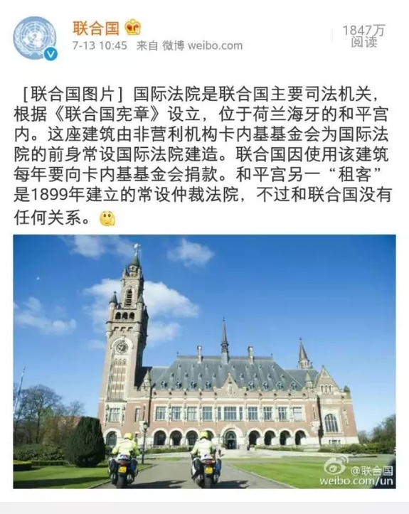 联合国官方微博发布信息称国际法院是联合国主要司法机关,根据《联合国宪章》设立,位于荷兰海牙的和平宫内。这座建筑由非营利机构卡内基基金会为国际法院的前身常设国际法院建造。联合国因使用该建筑每年要向卡内基基金会捐款。和平宫另一“租客”是1899年建立的常设仲裁法院,不过和联合国没有任何关系。