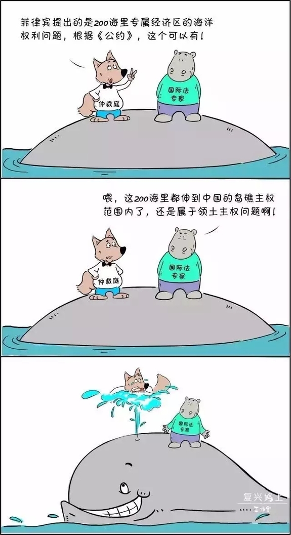仲裁庭由拿菲律宾提出的专属经济区的海洋权利问题说事儿,谁知又被国际法专家的一句话噎了回去:这200海里都到中国的主权范围了,还是领土问题啊!仲裁庭如此不专业,国际公众和舆论的大鲸鱼“喷”了。