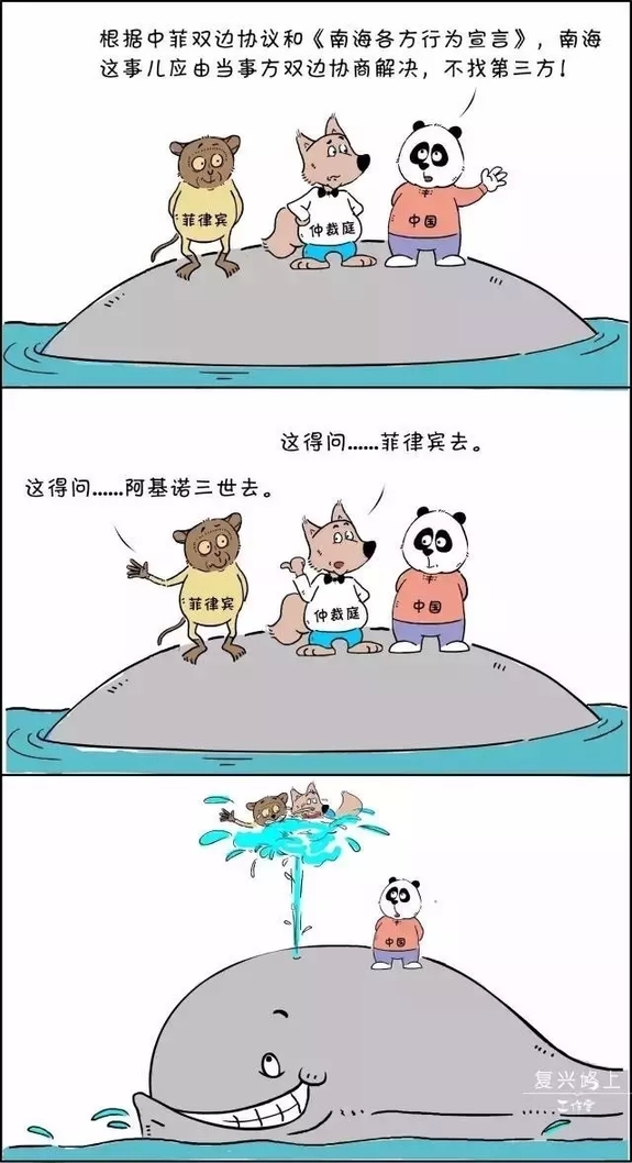 中国想要好好讲道理,大家坐下来谈,不找第三方。仲裁庭赶紧把“锅”甩给菲律宾,菲律宾……好像只能甩给已经走人了的阿基诺三世了…… 如此背信弃义,国际公众和舆论的大鲸鱼“喷”了。
