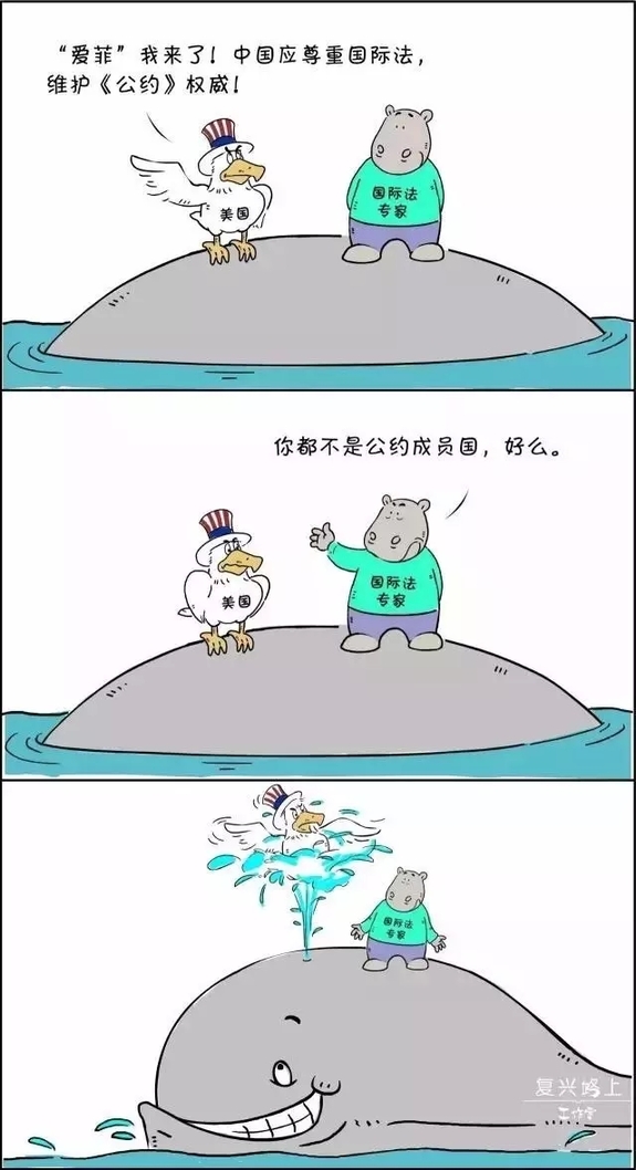 菲律宾屡屡碰壁,只能搬来美国这个救兵。谁知道国际法专家连美国的脸也一样打:你都不是公约成员国,不要瞎起哄了好吗?国际公众和舆论的大鲸鱼表示做搅屎棍很好玩吗?“喷”了!