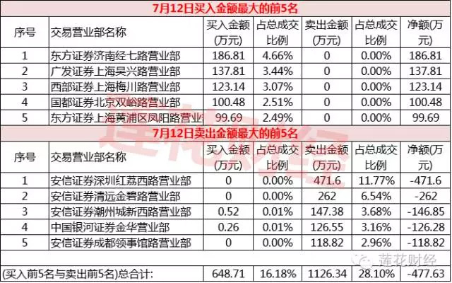 此外,7月12日,安信证券旗下深圳红荔西路、清远金碧路、潮州城新西路、成都领事馆路等4家营业部也集体跻身卖出前列,成为出逃的“赢家”,合计出逃金额达999.8万元,出逃股数为76万股。安信证券的通道优势体现得淋漓尽致。