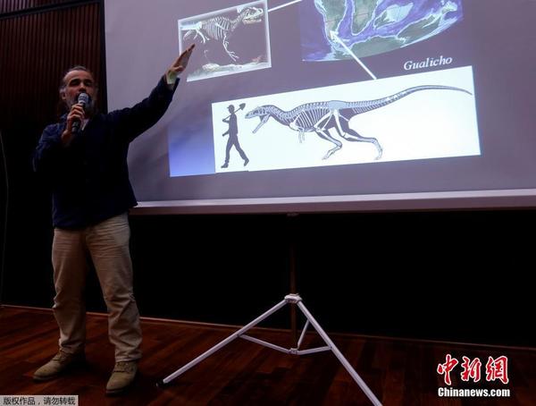 当地时间2016年7月13日,科研人员向公众介绍他们在阿根廷偶然找到的兽脚亚目恐龙化石,他们发现,这只恐龙拥有着不同于霸王龙的短小前肢。据了解,这只恐龙身高约为20英尺或更高,而它的前肢却只有2英尺长,并且每个前肢只有2根手指。
