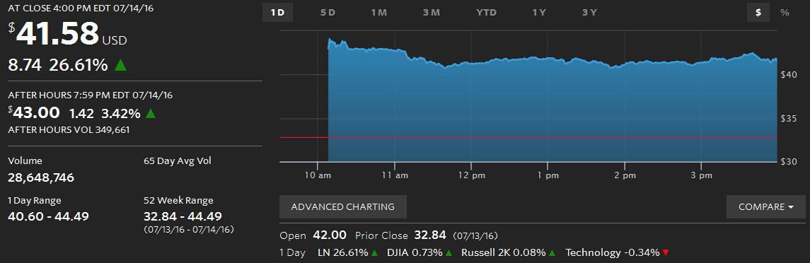 Line(LN,U.S.:NYSE)上市第一日股价走势