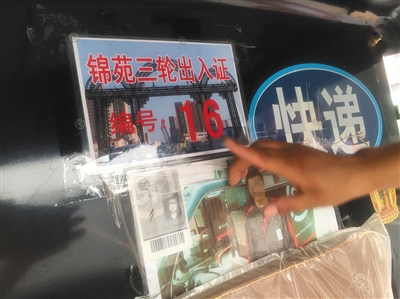 在一辆快递车的前方位置,贴有长方形“锦苑三轮通行证”,下方注有数字编号。