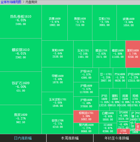 截止收盘,、铁矿石、螺纹钢、热卷跌停,跌幅为6%。焦炭跌5.27%,沥青跌3.97%,焦煤跌3.77%,玻璃跌3.66%,菜粕跌3.64%,豆粕跌3.55%,淀粉跌3.49%,甲醇跌3.40%,玉米跌2.24%,橡胶跌1.80%,沪银、沪铜、大豆、PP、PTA、沪铝、沪铅跌逾1%。涨幅方面,棕榈油涨1.54%,沪金(289, 0.50, 0.17%)涨0.17%。