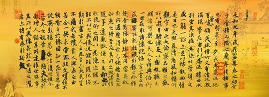 《兰亭序》是王羲之用茧纸、鼠须笔与朋友优游之余的得意之笔。关于这幅作品的来历,史料是这么记载的:据说在东晋时期,会稽山阴(今浙江绍兴)当地人有一个风俗,就是在每年农历得三月三日,人们必须去河边玩一玩,以消除不祥,这种做法在当地叫做“修褉”。话说永和九年的三月三日,王羲之和一些文人,共四十余位,到兰亭的河边“修褉”。由于都是文人,大家就一面饮酒,一面作诗。最后,大家作完了诗,又把诗集合起来,合成一本《兰亭集》。因为王羲之为人豪爽,又担任“饮酒作诗会”名誉会长,所以大家都一致公推他来为《兰亭集》作一篇序文。此时的王羲之已醉了,他趁着酒意灵感大发,拿起鼠须笔,在蚕茧纸上,挥起笔来。笔兴随酒兴而生,笔力、笔韵随酒力、酒韵而成。这篇序文,就是后来名震千古的《兰亭序》。
