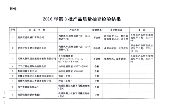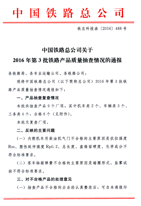 凤凰财经讯 7月26日,中国铁路总公司近日通报了《关于2016年第3批铁路产品质量抽查情况结果》。根据抽查结果显示,中国中车和中国船舶重工等多家企业铁路产品不合格。
