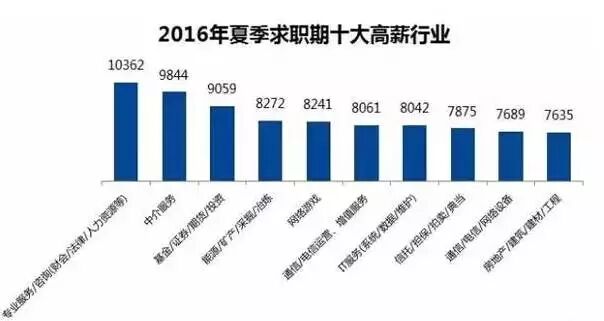 据智联招聘数据显示,2016年夏季求职期薪酬水平排名前十的行业中,位列第一和第二的行业是专业服务/咨询(财会/法律/人力资源等)、中介服务行业,平均月薪分别为10362元、9844元。基金/证券/期货/投资行业以9059元的平均薪酬,超过能源/矿产/采掘/冶炼行业,排名第三。