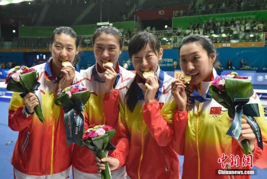 资料图:2014年9月25日,第17届亚运会击剑女子重剑团体决赛在韩国京畿道高阳体育馆举行,由孙玉洁、许安琪、孙一文、王晨(左起)组成的中国队以43:19战胜韩国队,夺得冠军。中新社记者 侯宇 摄