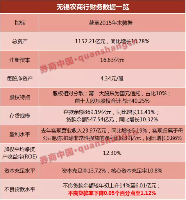 财务数据显示,截至2015年末,无锡农商行总资产为1152.21亿元,位列全省农信系统第2名,较年初增加112.16亿元,增长10.78%。