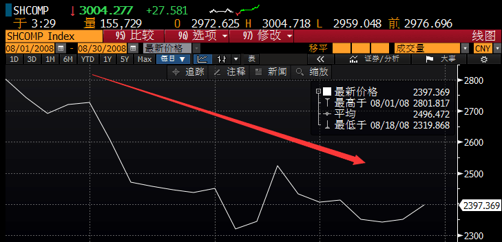2008年8月,上证指数从2801点暴跌至2397点,单月跌幅超14%,月度振幅达17%。从2008年8月8日奥运会开幕,截止8月24日奥运会闭幕,不到20天时间里,上证指数暴跌7.69%。