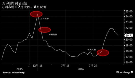 持有万科股票的投资者则仿佛坐上了过山车。在截至8月1日的四周中,结束半年停牌的万科A股下跌了近30%,追赶H股在过去半年的跌势。而随着恒大入股的消息传来,万科在本月止跌回升,上涨了24%。