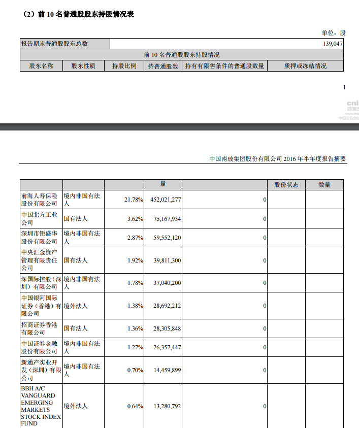 凤凰财经讯8月15日, 南玻A公告称,截止2016年6月30日,前海人寿持有公司4.52亿股股份,占比21.78%;钜盛华持有5955.21万股股份,占比2.87%。宝能系持股比例合计占24.65%。