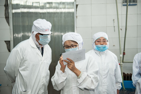 认证机构正在高白鲑加工厂检查包装和标识审核、现场抽样等。