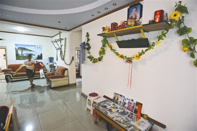 妻子过世后,张文良并没有为她找墓地,而是把骨灰盒搬回了家里,放在客厅上方的一个木架上。一张彩色的遗像,面带笑容,照片前放着一个方形的骨灰盒,用各种小礼品围绕。一旁是妻子去世前过生日时的寿星纸帽,架子下方的小桌上摆放着曾经两人一同旅游的留影。