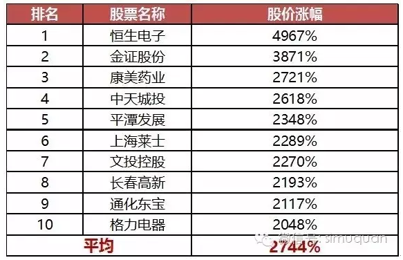 恒生电子涨幅近50倍居首,格力电器上涨20倍排名第十,十大牛股平均涨幅超过27倍。