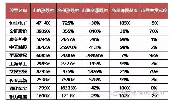 (1)无论周期长短,市值成长最快的公司大多都有良好的业绩作为支撑,净利润的贡献度中都居主导地位,只有少数公司能够通过提升市盈率的方式提升公司市值;