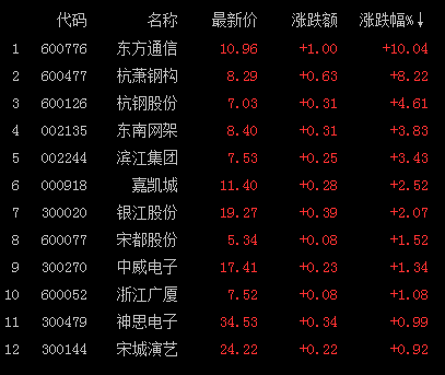 截至发稿,东方通信涨停,杭萧钢构、东南网架、杭钢股份、滨江集团等涨逾7%。