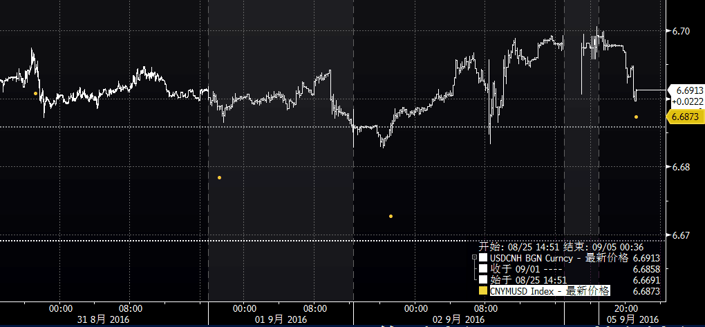 人民币兑美元中间价下调146点,报6.6873元,上周五中间价报6.6727元;上周五16:30收盘报6.6800,23:30收盘报6.6821。
