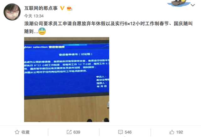 微博账号@互联网的那点事po 出的一张图片遭到众多用户的吐槽,图片内容是浪潮公司“奋进者”选拔计划的一张PPT,这张PPT上写着:申请成为公司的奋进者,自愿放弃所有带薪年休假,自愿进行非指令性加班、自愿每天工作12个小时、每周工作6天,除此之外,春节、国庆等大假期还需随叫随到,无条件加班……