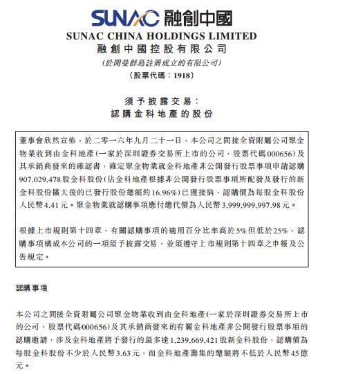 9月21日22时53分,孙宏斌名下融创中国(1918.HK)发布公告披露,公司间接全资附属公司聚金物业认购金科地产(000656)非公开发行股票9.07亿股,占金科已发行股份总额约16.96%。融创在公告中称,金科地产在中国主要的核心二线城市从事房地产开发,拥有较好的城市布局。