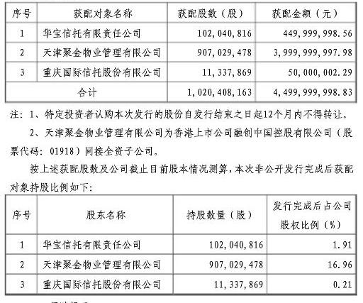 据金科9月22日发布的公告,除融创外,两家信托公司华宝信托以及重庆国际信托也参与了此次增发。