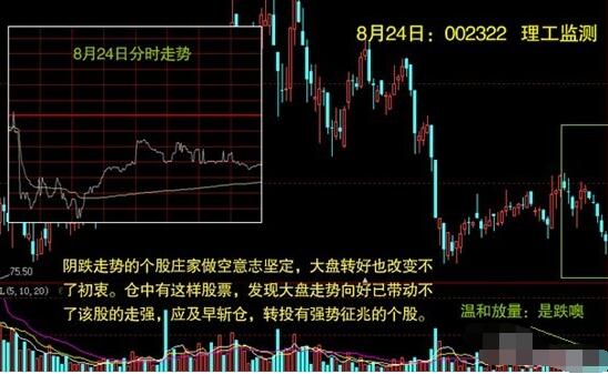 前面讲过股价急跌不可怕,那是庄家震仓行为。阴跌则不同,那是庄家出逃的真动作,出发点多在股价的高位区或者有鸡狗有了新欢。庄家要拉高出货势会受到获利盘抛压。无疑要造成不必要的资金损失,而急跌又不能卖出好价钱。唯有阴跌适中,因为有些人看大势向好,料想该股会跟随或有反弹。阴跌走势的个股庄家做空意志坚定,大盘转好也改变不了初衷。仓中有这样股票,发现大盘走势向好已带动不了该股的走强,应及早斩仓,转投有强势征兆的个股。