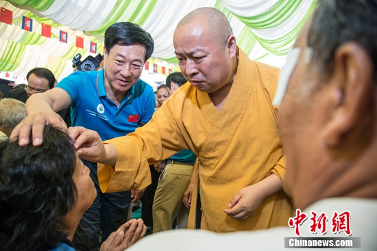 图为中国佛教协会副会长、海南省佛教协会会长印顺大和尚为术后患者揭纱布。中新社记者 洪坚鹏 摄