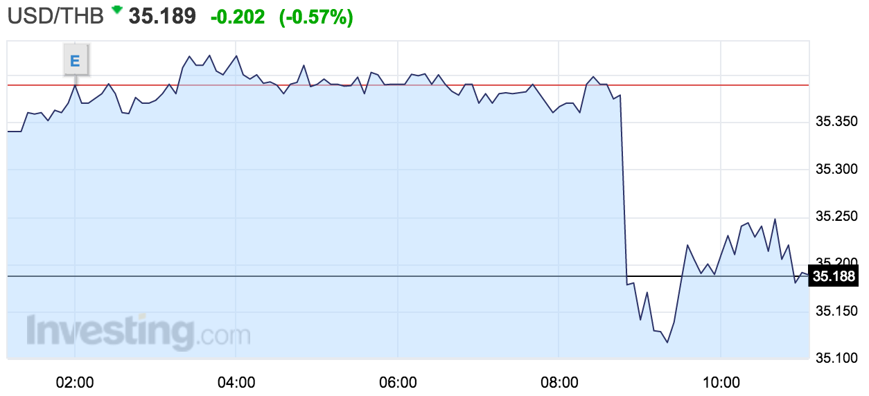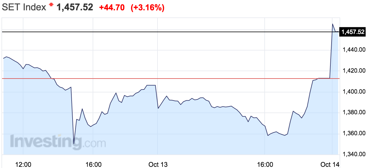 今日(10月14日),泰国SET指数开盘涨3.4%至1461.42,随后涨幅扩大至3.8%,创2013年以来最大涨幅。美元对泰铢汇率则开盘跳水,一度下跌1.6%至35.056泰铢,创三年最大跌幅。