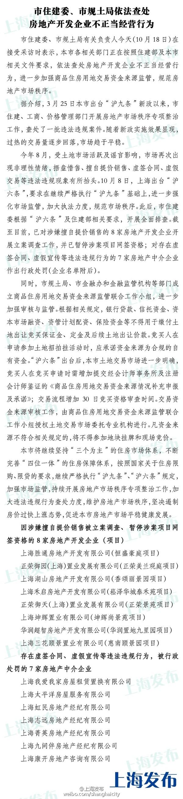 中国证券网讯 据上海发布10月18日消息,上海市住建委、上海市规土局今天表示,上海市各相关部门正在按照住建部及上海市相关文件要求,依法查处房地产开发企业不正当经营行为,进一步加强商品住房用地交易资金来源监管,规范房地产市场秩序。上海市住建委强调,上海将继续严格执行“沪九条”、“沪六条”规定,促进上海市房地产市场平稳健康发展。