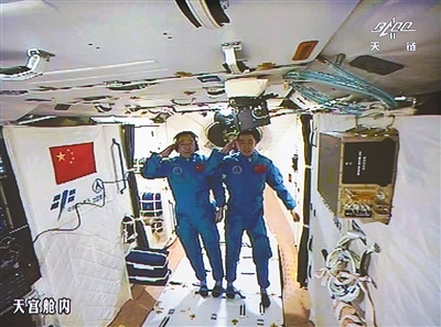 昨日,景海鹏(左)和陈冬在天宫二号实验舱向全国人民问好并敬礼。新华社记者 琚振华 摄