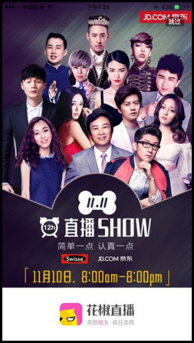 今年也不例外,创新营销还是各家电商的“吸睛”之笔。因此,被称为“直播元年”的2016年,直播平台自然成为各大电商巨头竞相合作的首选,电商+直播也是今年“双十一”大战最引人注目的亮点。有消息称,京东、苏宁均已选择花椒直播平台作为跨界合作品牌,联手亮相”双十一”大战,同时花椒直播也宣布:双11当天礼物全场5折。