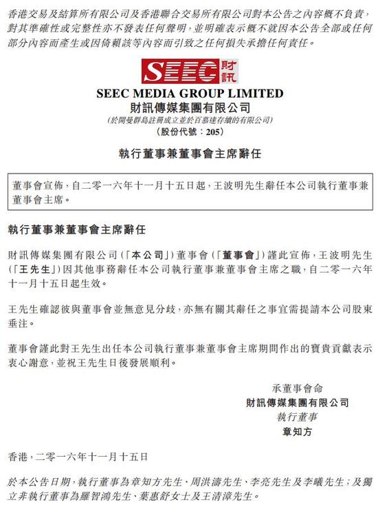 凤凰财经讯 11月15日消息,财讯传媒集团有限公司(00205.HK)发布公告,王波明辞任公司执行董事兼董事会主席之职。
