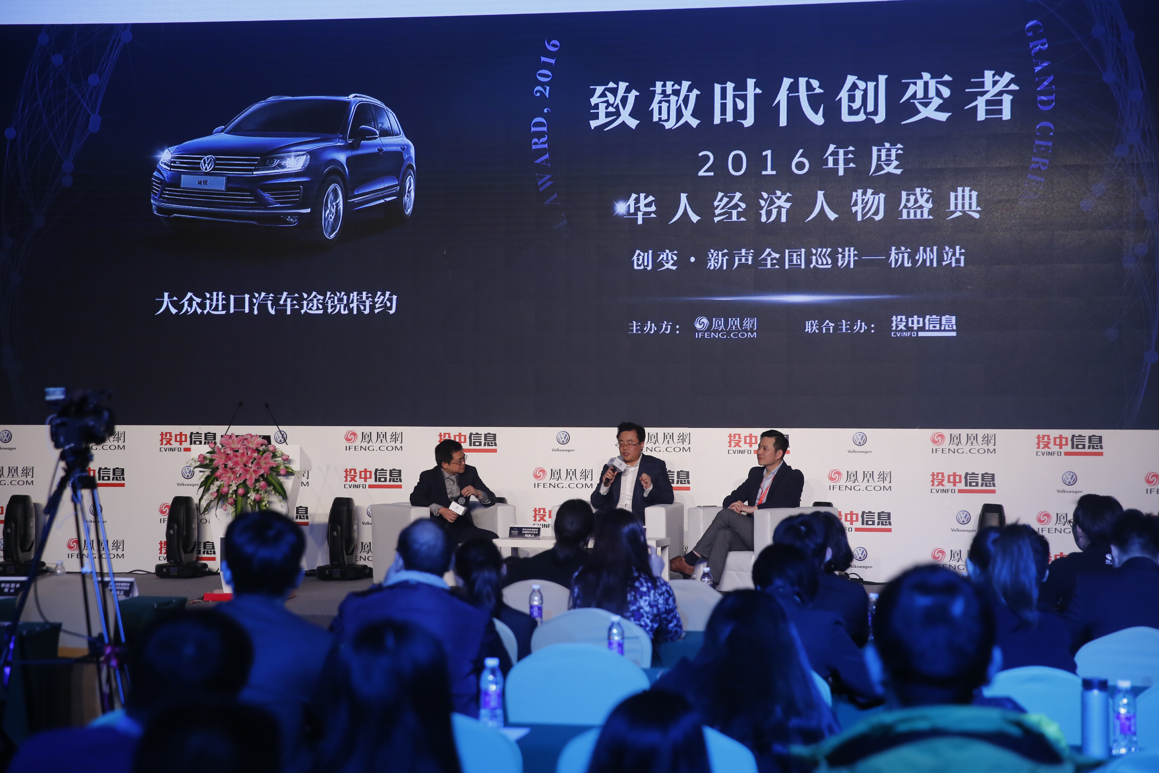 11月23日,由大众进口汽车途锐特约,凤凰网与投中信息联合主办的“致敬时代创变者——2016年度华人经济人物盛典”创变•新声全国巡讲杭州站成功举办。活动中,青鸟体育董事长卞光明,华医资本创始合伙人刘云,著名商业观察家、央视财经评论员陆新之三位嘉宾聚焦“大健康产业发展逻辑”,与现场听众一起“掘金”医疗、健身产业的未来市场。