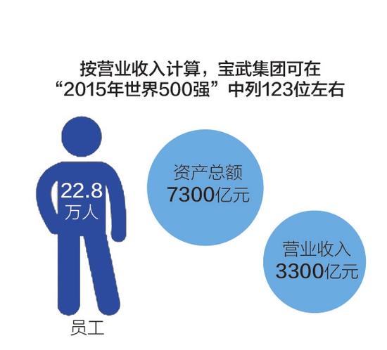 资料显示,目前宝武集团拥有员工22.8万人,资产总额约为7300亿元,营业收入将达3300亿元,按营业收入计算,可在“2015年世界500强”中列123位左右。