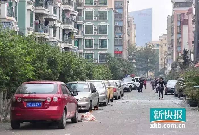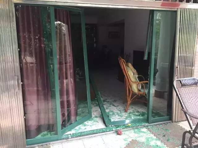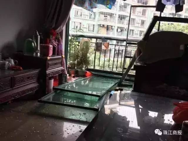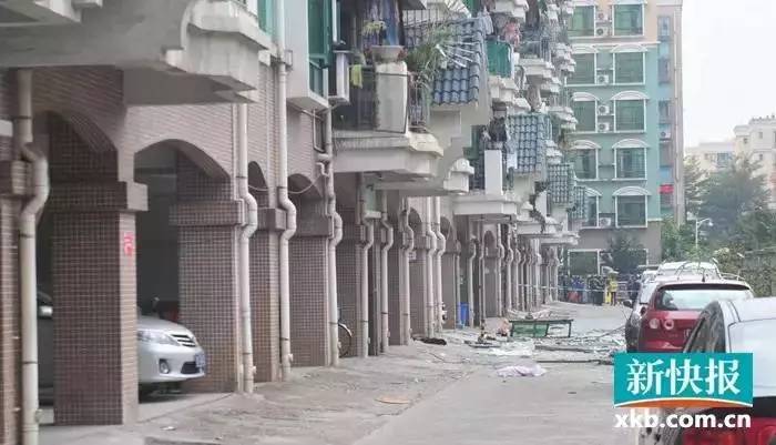 事发现场位于顺德区北滘镇南源花园。今天中午12时许,新快报记者来到事发现场看到,整个南源小区至少有6 栋居民楼被警戒线围蔽,数十户的玻璃窗都有不同程度的破裂,楼下几百平方米的地面上满是玻璃碴。