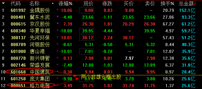 整个雄安新区板块,今日成交额高达975亿元,占整个上证指数的43%,接近中小板的成交额,远超创业板。金隅股份更是以152亿元的天量成交,成为两市第一大成交额个股,并且两市成交额前9大个股均为雄安概念股。