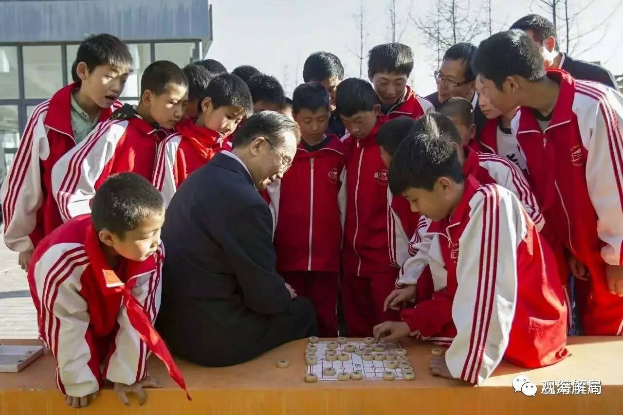 (在兴县一二0师学校,温家宝与学生们下象棋)