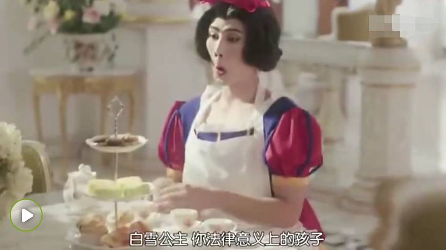 比如这个从《白雪公主》改编的广告,同样是“变性”元素尬入,但就无伤大雅:白雪公主、白雪的“妈妈”、魔镜,都是男的。