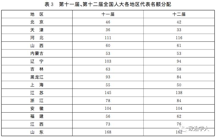 从下表可以看出,废除“四分之一条款”后,十二届全国人大中,黑龙江、辽宁、吉林等老工业区的代表人数进一步减少,但湖北、江苏、山东的代表人数也下降了,这是1995年那一次没有出现的;北京、上海、天津、重庆三个直辖市的代表名额也有一些减少,但幅度不大;宁夏、西藏、内蒙古、新疆、广西五个民族自治区的名额没有变化或略有增加。为什么会出现这种情况?