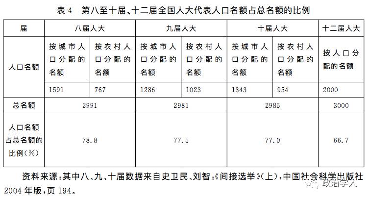 实际上这在历史上并非第一次出现。1995年八届人大第三次修改《选举法》,将分配全国人大代表的城乡人口比例从“农村每一代表所代表的人口数八倍于城市每一代表所代表的人口”,改为“农村每一代表所代表的人口数四倍于城市每一代表所代表的人口”,也就是从“八分之一条款”改为“四分之一条款”。从适用“八分之一条款”的八届人大到适用“四分之一条款”的九届人大,代表名额减少较多的几个省份是辽宁(减少20.5%)、黑龙江(减少19.8%)、吉林(减少18.2%)、浙江(减少15.3%),其中东三省是传统上的工业区,城市人口比例较大,受此条款影响较大。代表名额增加的省份有河南、江苏、湖北、河北、湖南、安徽等,都是传统上人口较多、农业人口比例较大的省份。北京、上海、天津几个直辖市的代表名额有所减少,但幅度不大。几个少数民族自治区和云南、贵州等少数民族较多地区的名额的变化都不大。