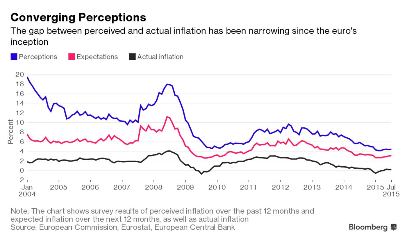 另外,单一货币欧元问世时,人们的感受与现实之间的差距达到了峰值,此后的情况则慢慢在改善,或许部分归因于过去几年来的通胀率一直接近于零。