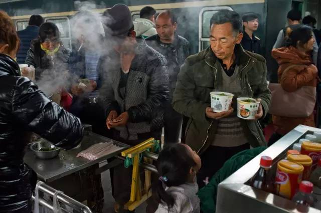 每年春运,去坐绿皮火车,有经验的农民工都带着被子,坐在座位上,或坐在存放食物的油漆桶上,裹起棉被。寒冷的冬天,车厢保温桶里的水会迅速冷下来,完全泡不开方便面。列车停靠大站时,车上的乘客带着自己的方便面走下车,排队泡面,泡一碗面两块钱,场面非常壮观。