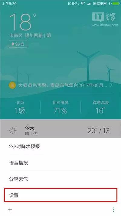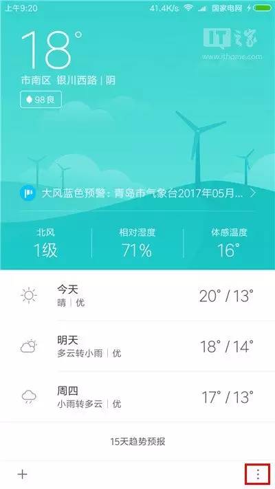 进入天气,点击右下角的菜单按钮(竖排三个圆点);